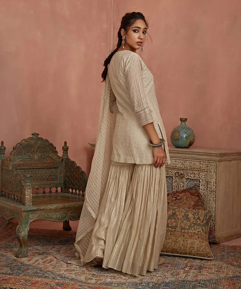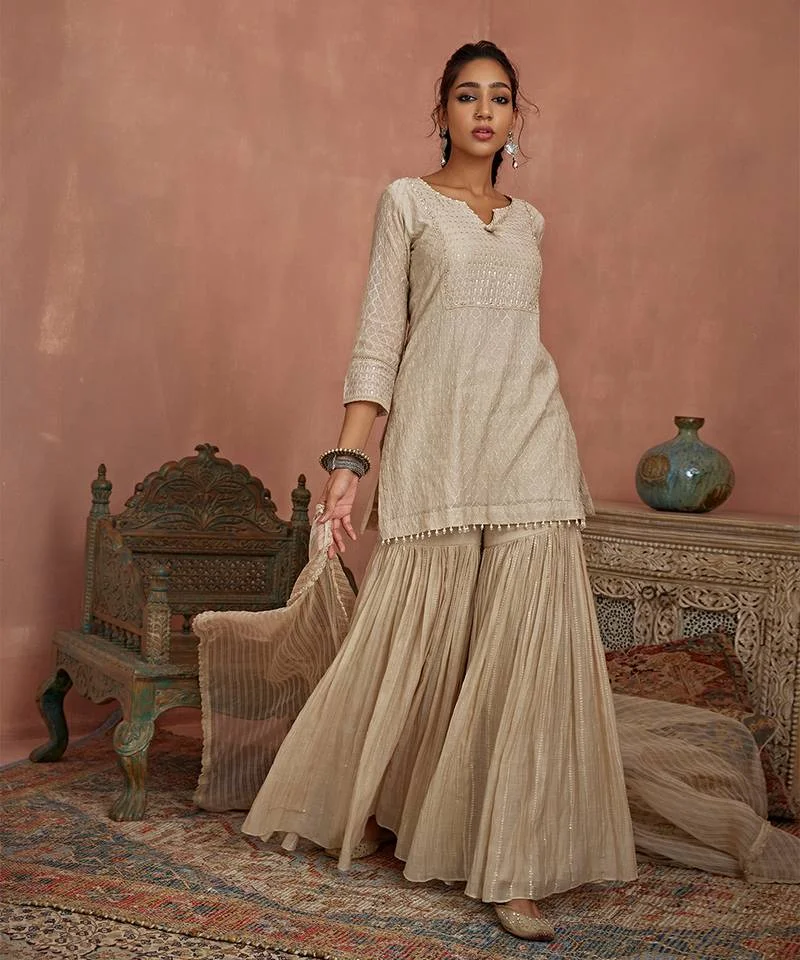 Beige Textured Kurta with Subtle Embroidery and Flowy Sharara Set