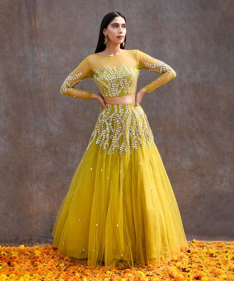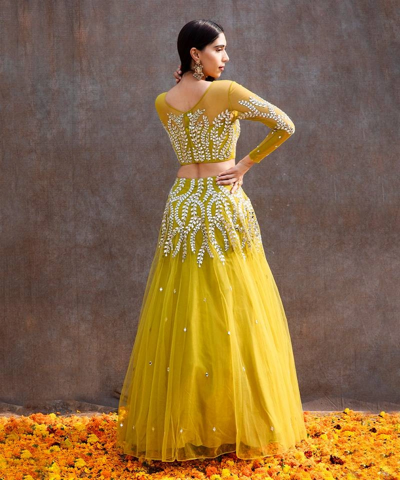 This stunning yellow lehenga choli is a perfect blend of elegance and tradition, crafted with intricate detailing and contemporary style. Designed with a sheer full-sleeve blouse and heavy mirror work embroidery, it offers a glamorous yet graceful look for weddings, parties, and festive occasions.