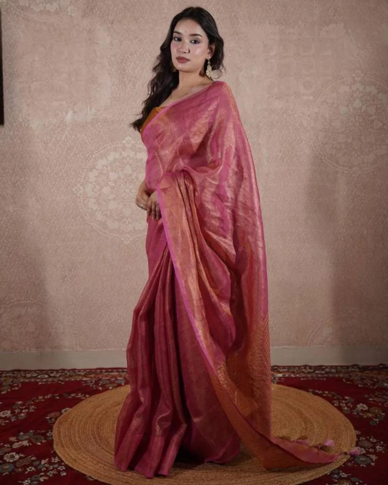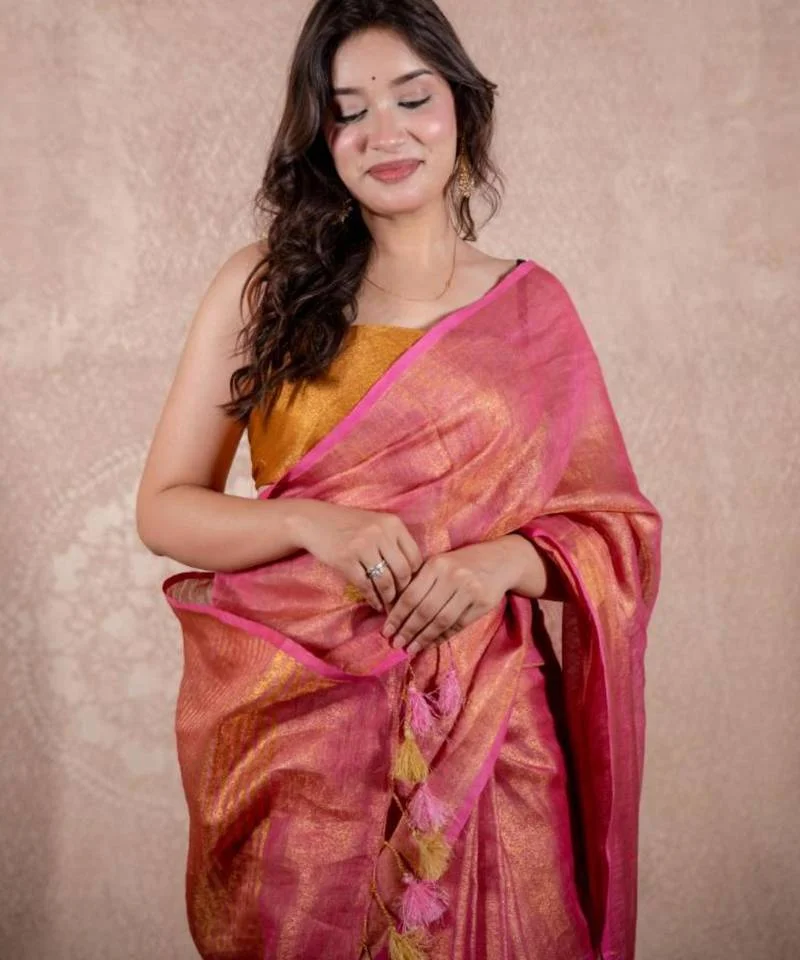 Elegant Pink and Golden Tissue Silk Saree with Shimmering Finish, Tassel Detailing, and Unstitched Blouse Piece