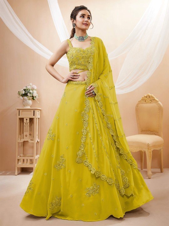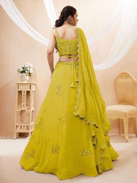 + Free ShippingYellow and gold-toned embellished lehenga choli with dupatta, sequinned