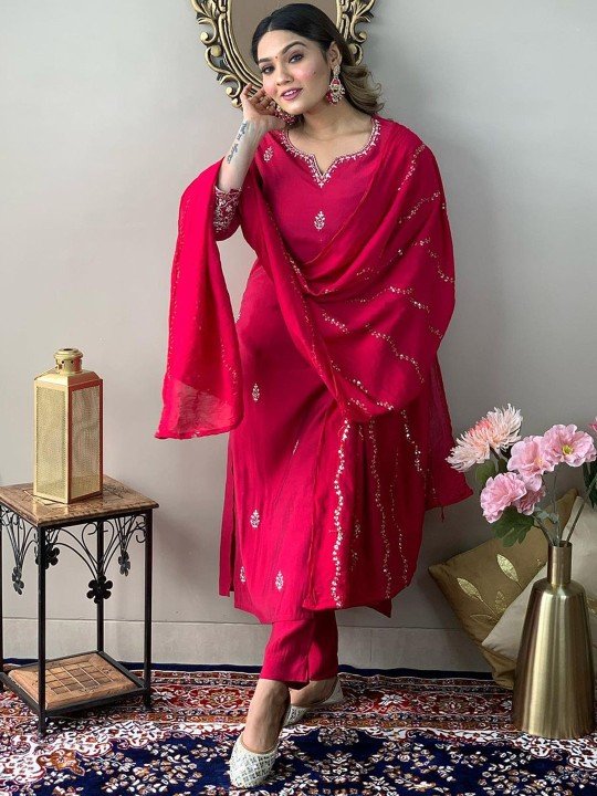 Be the first to review “Ethnic Motifs Embroidered Thread Work Detail Straight Kurta & Trousers With Dupatta”