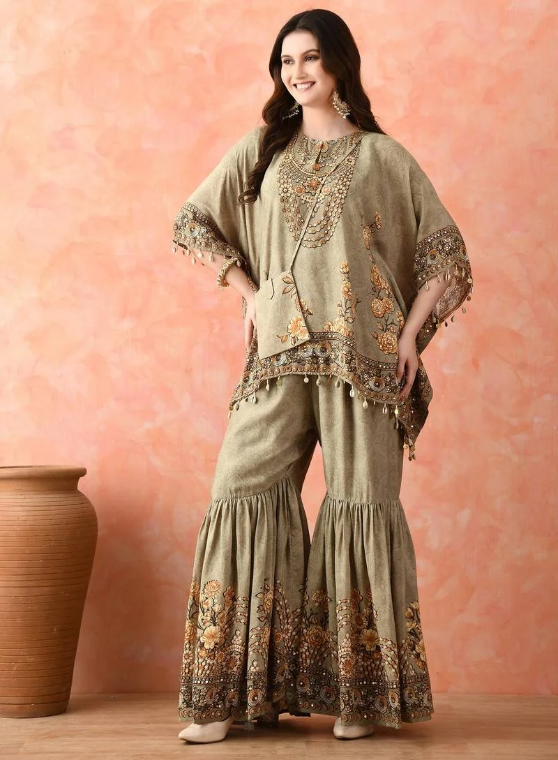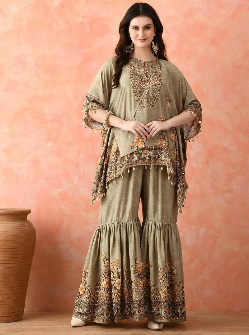 Olive Green Kaftan-Style Kurta with Mirror Embroidery and Flared Sharara Pants