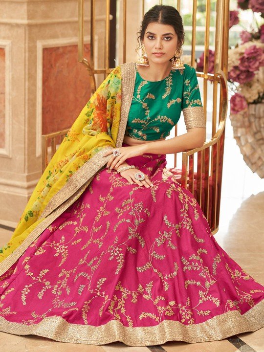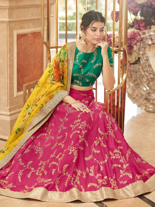 + Free ShippingPink and yellow embroidered lehenga choli with dupatta, zari