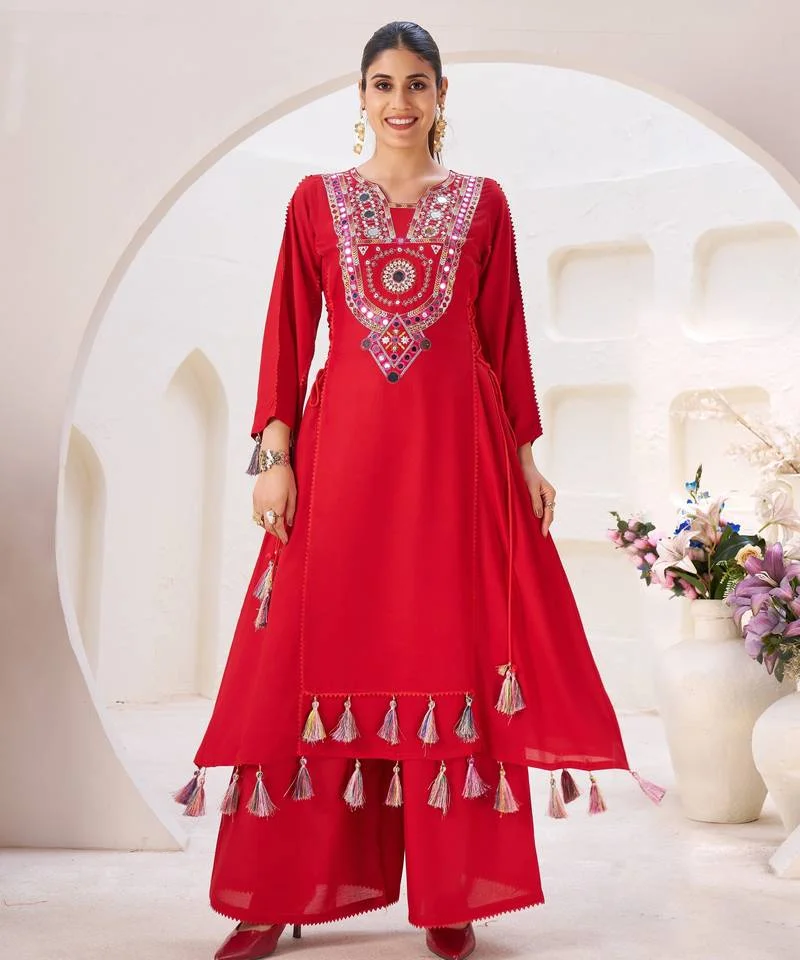 Red Mirror Work Kurta Set with Multicolor Tassel Accents – Festive Indo-Western Ensemble