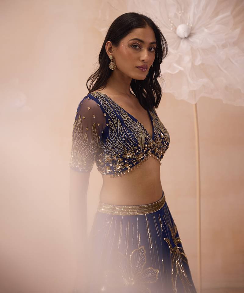 Choli: Deep V-neck blouse with bead and zari embroidery, featuring sheer sleeves for a chic look.