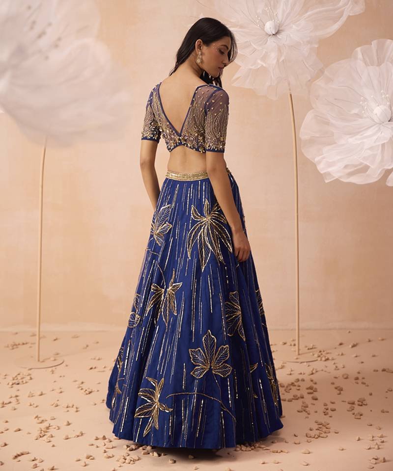 Royal Blue Designer Embroidered Lehenga Choli with Net Dupatta Featuring Golden Zari, Sequins, and Bead Work for Wedding, Reception, Cocktail Party, and Festive Celebrations