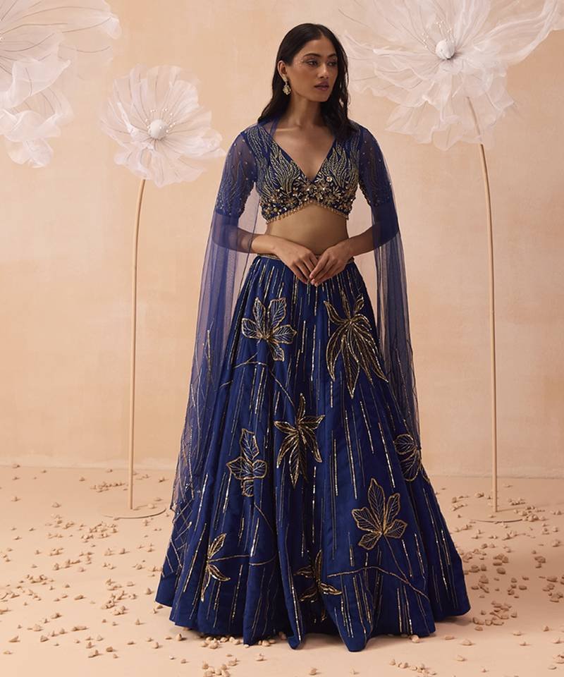 + Free ShippingStep into elegance with this stunning royal blue lehenga choli, beautifully embellished with golden embroidery and sequins. The luxurious craftsmanship and modern cut make it an ideal choice for glamorous occasions.